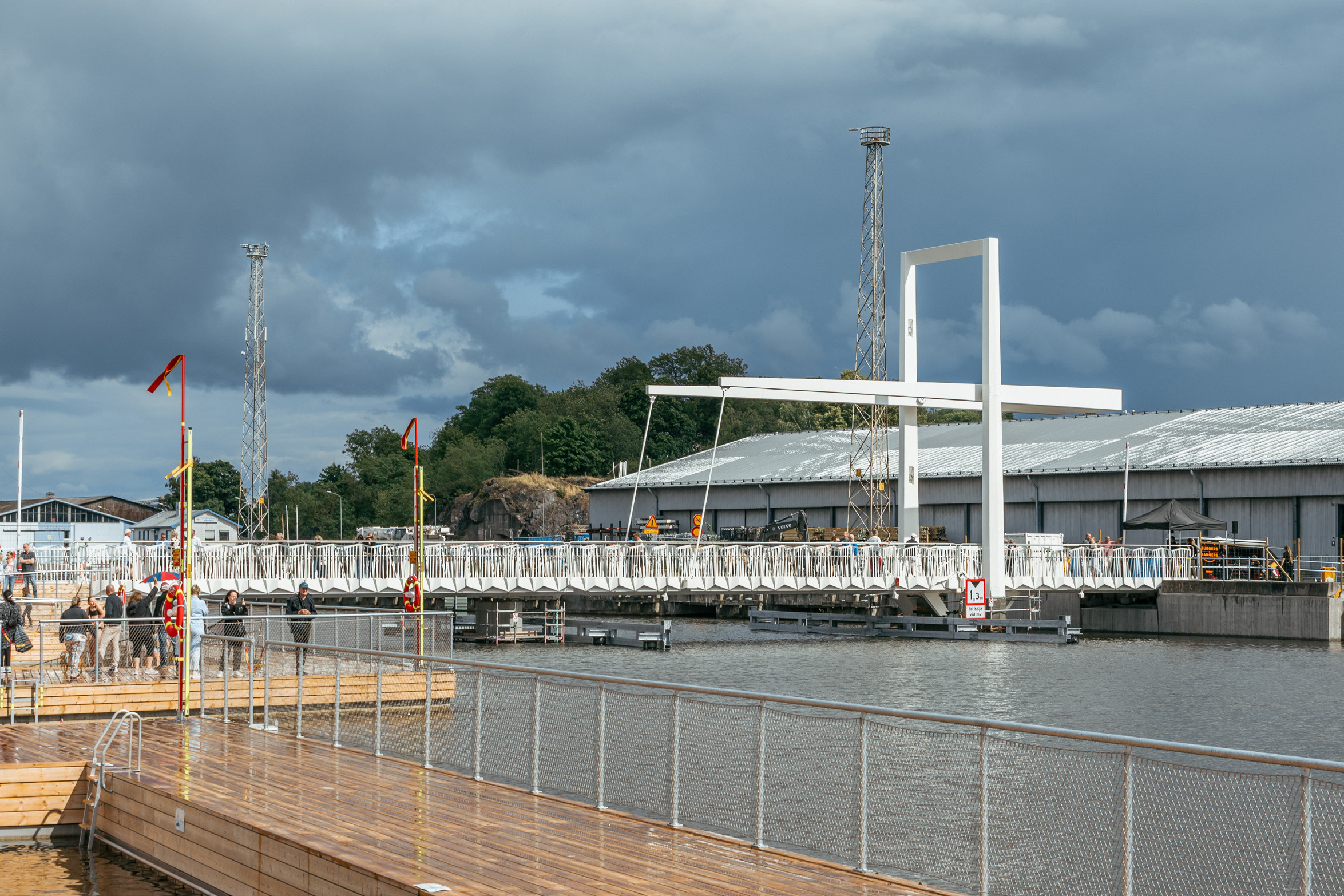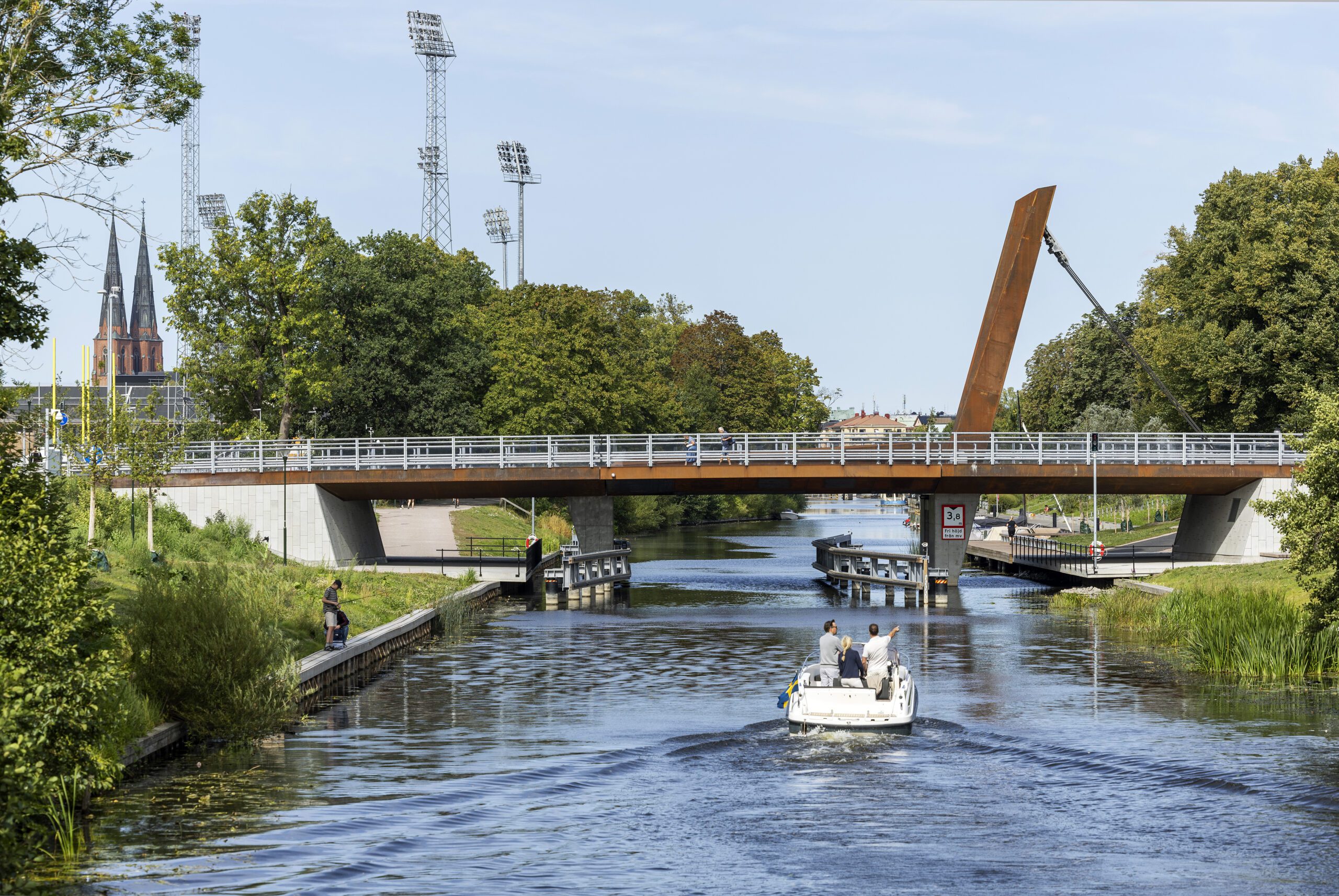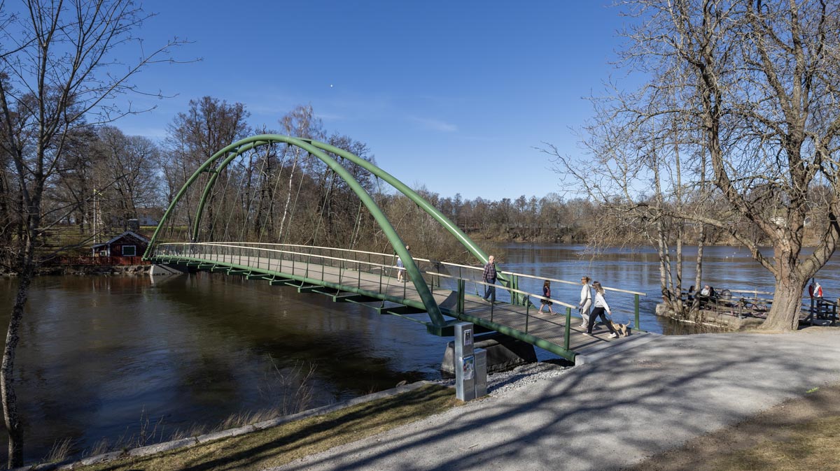 Den gamla Femöresbron från 1901 har ersatts av en bågbro mellan de befintliga brofundamenten i Motala ström. Utifrån konceptet med de lutande bågarna har en ytterligare dynamik utvecklats genom att brobanan fått en elliptisk planform.
