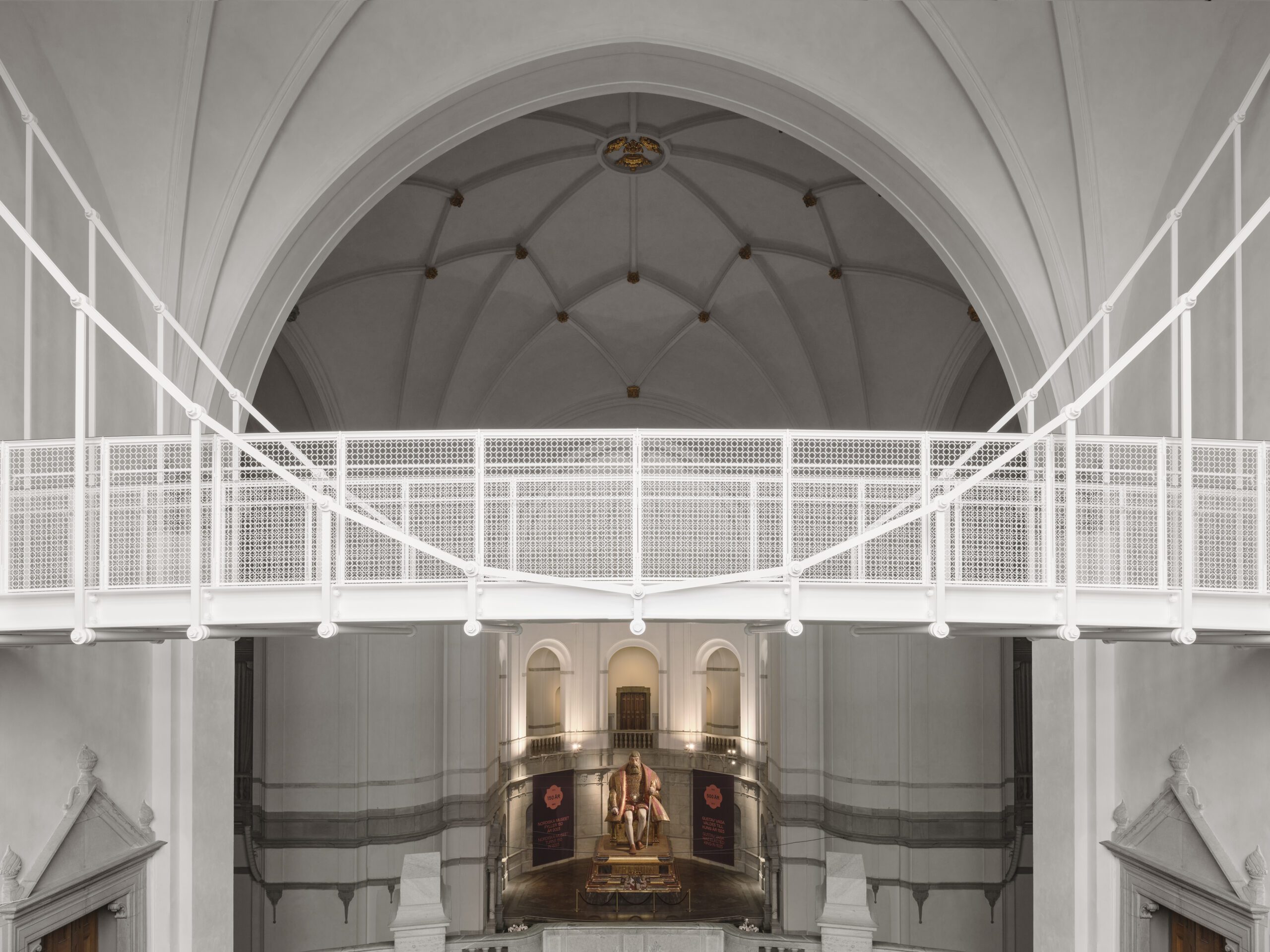 Att bygga en bro på 12 m inne i ett byggnadsminne med ovärderliga samlingar och arkiv ställde specifika krav. Svaret blev en bro i stål som kan lyftas in i bärbara delar och på sin plats skruvas ihop med enkel mekanik.