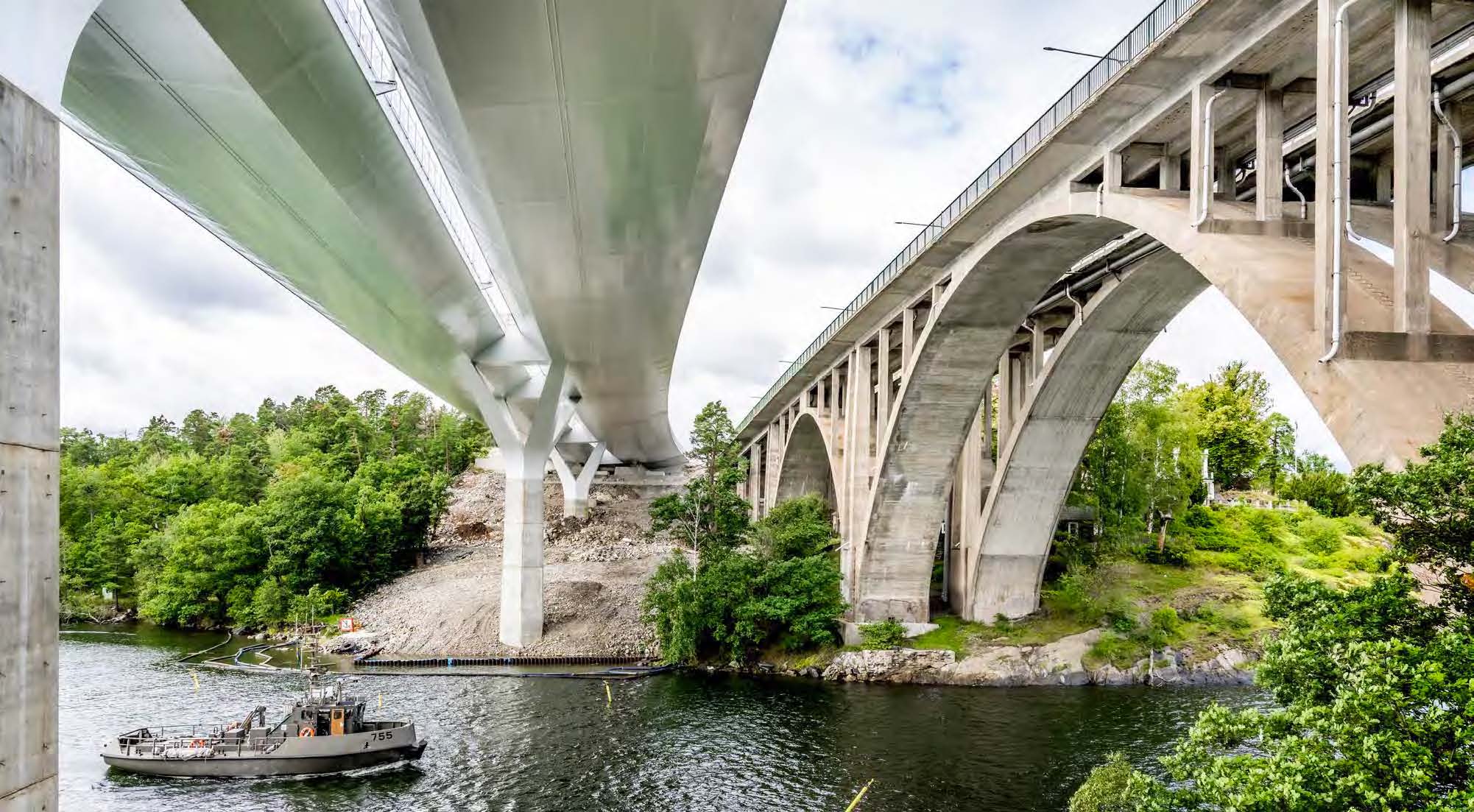 Stål var nyckeln till att lösa platsens komplexa geometriska och miljömässiga begränsningar. Däcket har slutna ”vingfiprofiler”-sektioner gjorda av två separata ortotropiska stållådor i två spann på 68 och 98 meter.