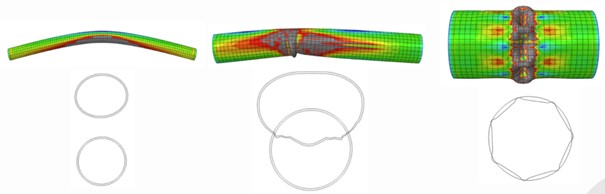 Figur 2: Element- och tvärsnittdeformation från ickelinjär FE-analys för global (vänster), interaktiv (mitten) och lokal (höger) knäckning.