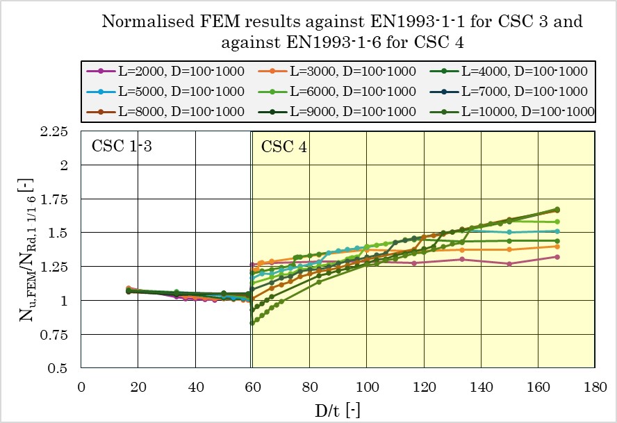 Resultaten av den parametriska studien i jämförelse med designriktlinjerna visar att den nuvarande designmetoden skapar problem för stålrör i tvärsnittsklass 4 då dessa betraktas som en skalstruktur medan deras beteende liknas vid en pelare. Detta ledde till både över- och underdimensionering av stålrören. För att hitta en bättre metod undersöktes en effektiv area-metod och en lokal knäckningsreduktionsfaktor från brittiska standarden för stålbyggnad (BS5950-1) och en studie av Toffolon och Taras (2017). Dessa två designmetoder överensstämde bättre med resultaten och gav både säkrare och mer effektiv dimensionering av stålrör i tvärsnittsklass 4.