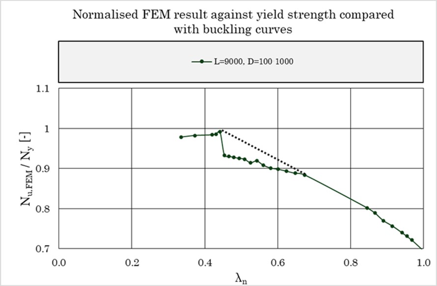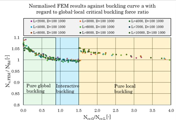 Arbetet behandlar interaktion mellan knäckning och skalbuckling hos tryckta konstruktions-element utformade som cylindriska skal. Metodiken är parametrisk elastoplastisk andra ordnin-gens finit elementberäkning. En kombination av lokala och globala imperfektioner ansätts spän-ningsfritt i modellen varefter laster läggs på inkrementellt och nodkoordinater uppdateras efter varje lösningssteg. Lösningen framskrider till dess jämvikt inte längre kan upprätthållas och då är bärförmågan funnen. Formen på initialimperfektioner fås ur egenvärdesanalys och deras storlek hämtas från eurokod 3, del 1-14 och 1-6. Resultat jämförs därefter med normenlig predik-terad bärförmåga och avvikelser diskuteras. Arbetet är snyggt och väldisponerat och använd metod är state-of-the-art. Kort sagt ett utmärkt examensarbete och välförtjänt av priset som bästa examensarbete inom Stålbyggnad 2025.