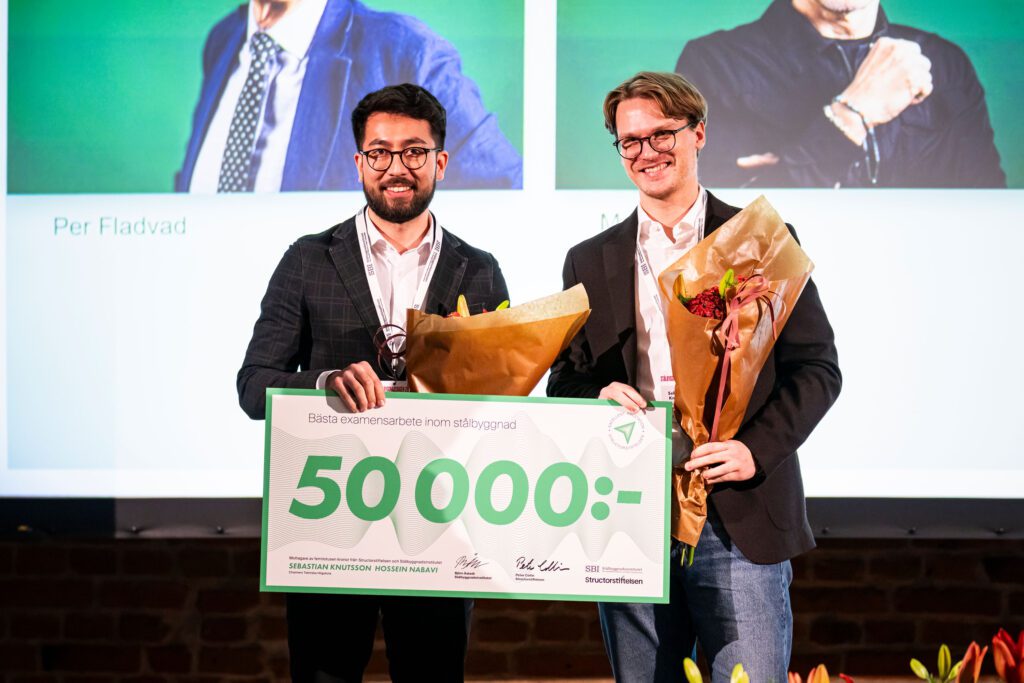 På Stålbyggnadsdagen delades stipendiet för bästa examensarbete 2025 ut till Sebastian Knutsson och Hossein Nabavi från Chalmers Tekniska Högskola. Handledare har varit Jincheng Yang, WSP och Fatima Hlal, Chalmers Tekniska Högskola. Examinator: Mohammad al-Emrani. Stipendiet finansieras av Structorstiftelsen.