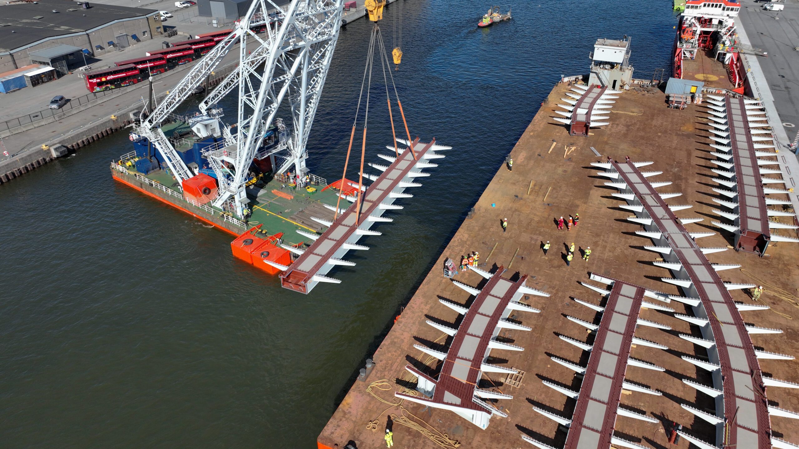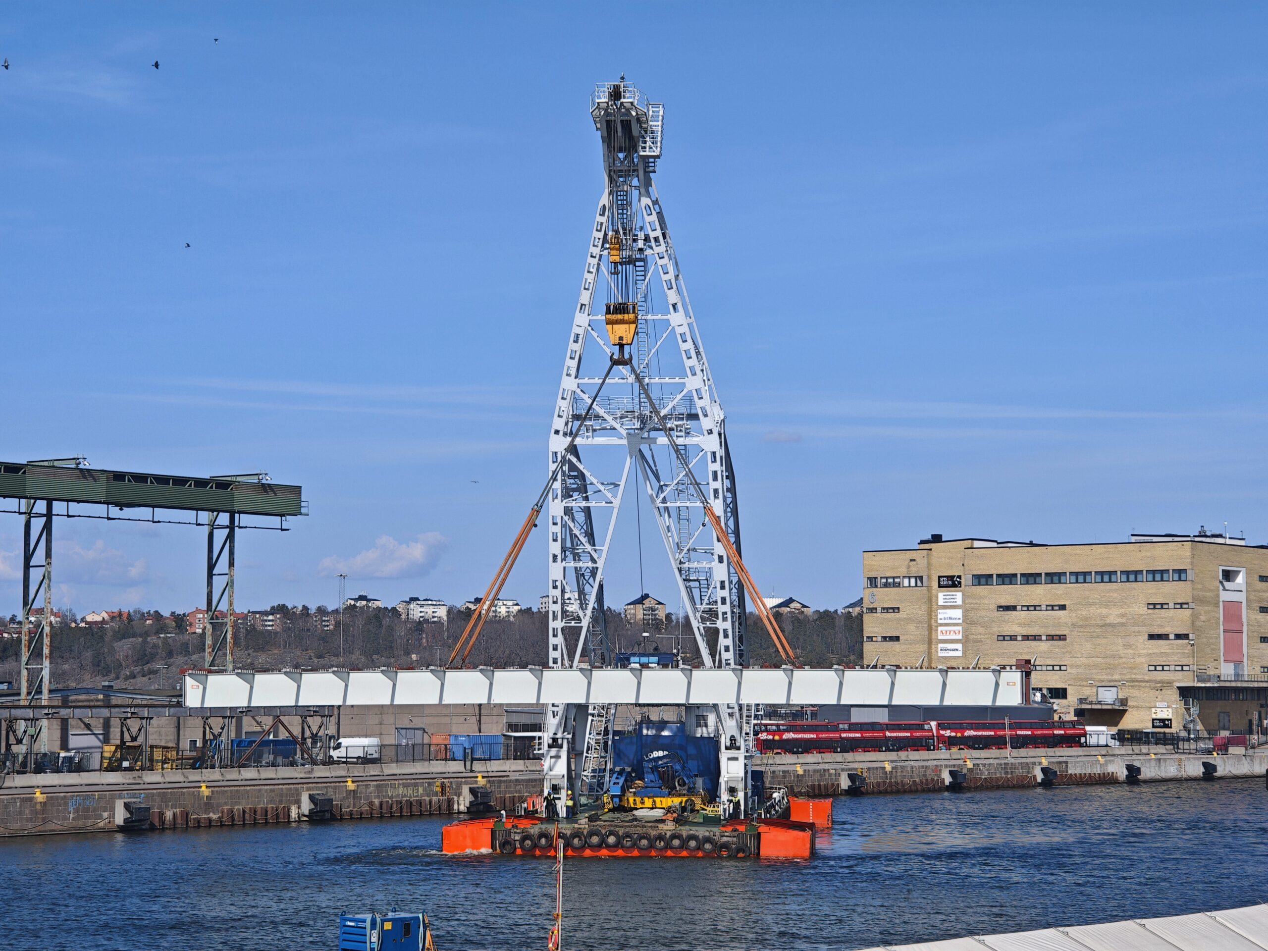 Efter nästan 70 timmar till havs anlände Slussens nya gång- och cykelbro till Frihamnen i Stockholm. De sex brosektionerna lastas om med hjälp av lyftkranen Lodbrok – samma kran som var med och bärgade regalskeppet Vasa, och som nu får vara med om ännu ett historiskt ögonblick! Snart väntar brons sista resa till Slussen – brodelarna transporteras i omgångar via både Hammarbyslussen och nya Victoriaslussen.