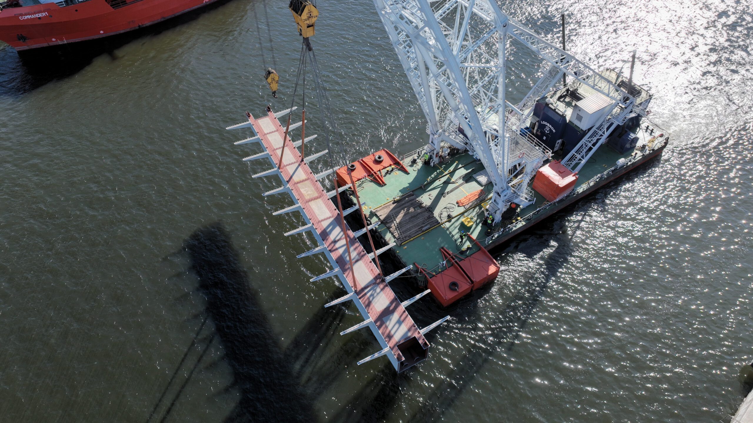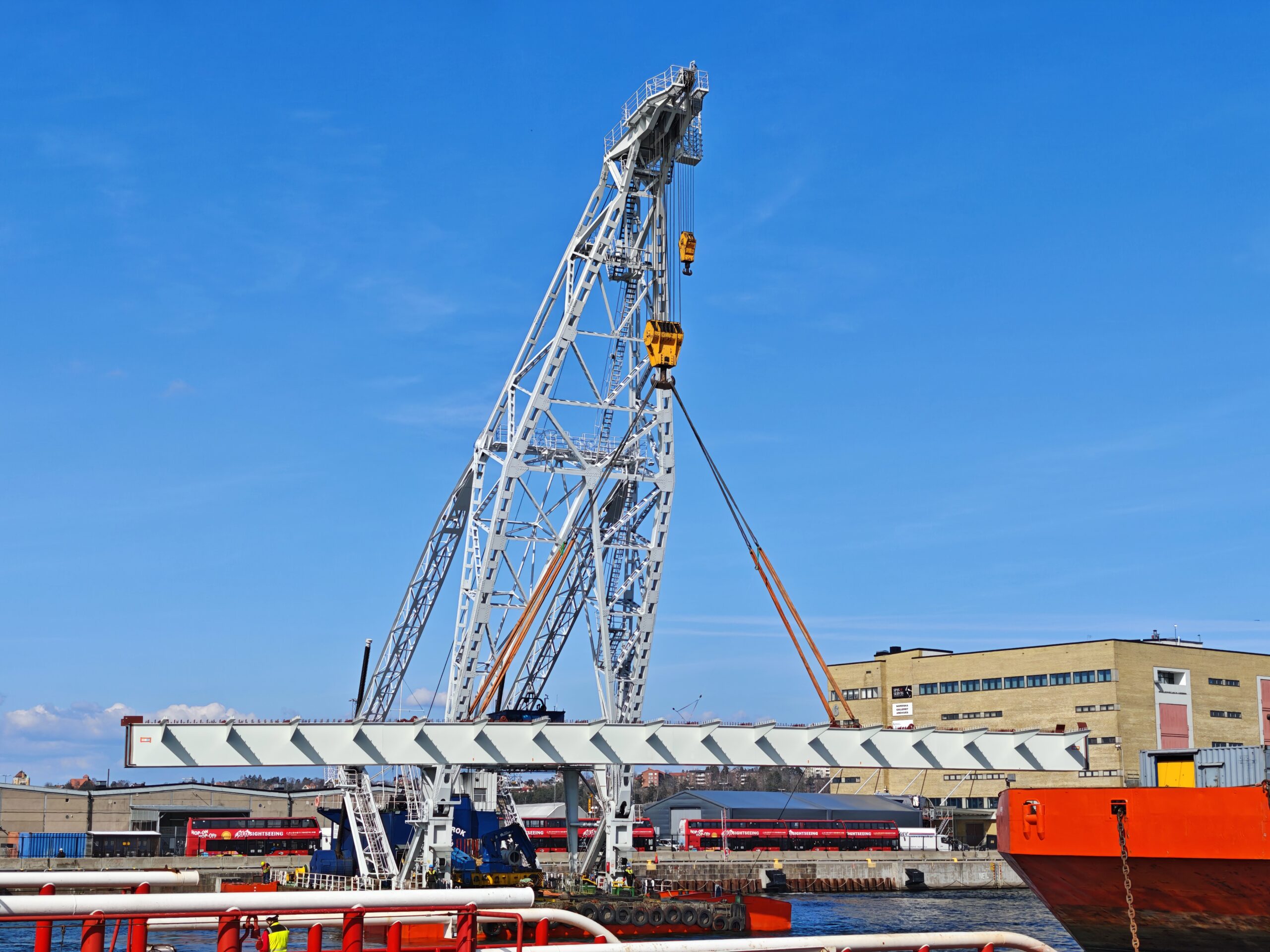 Brosektion B (36 m lång och 90 ton stål) lyfts från pontonen för att göras redo att transporteras till Slussen under måndag morgon. Foto Skanska