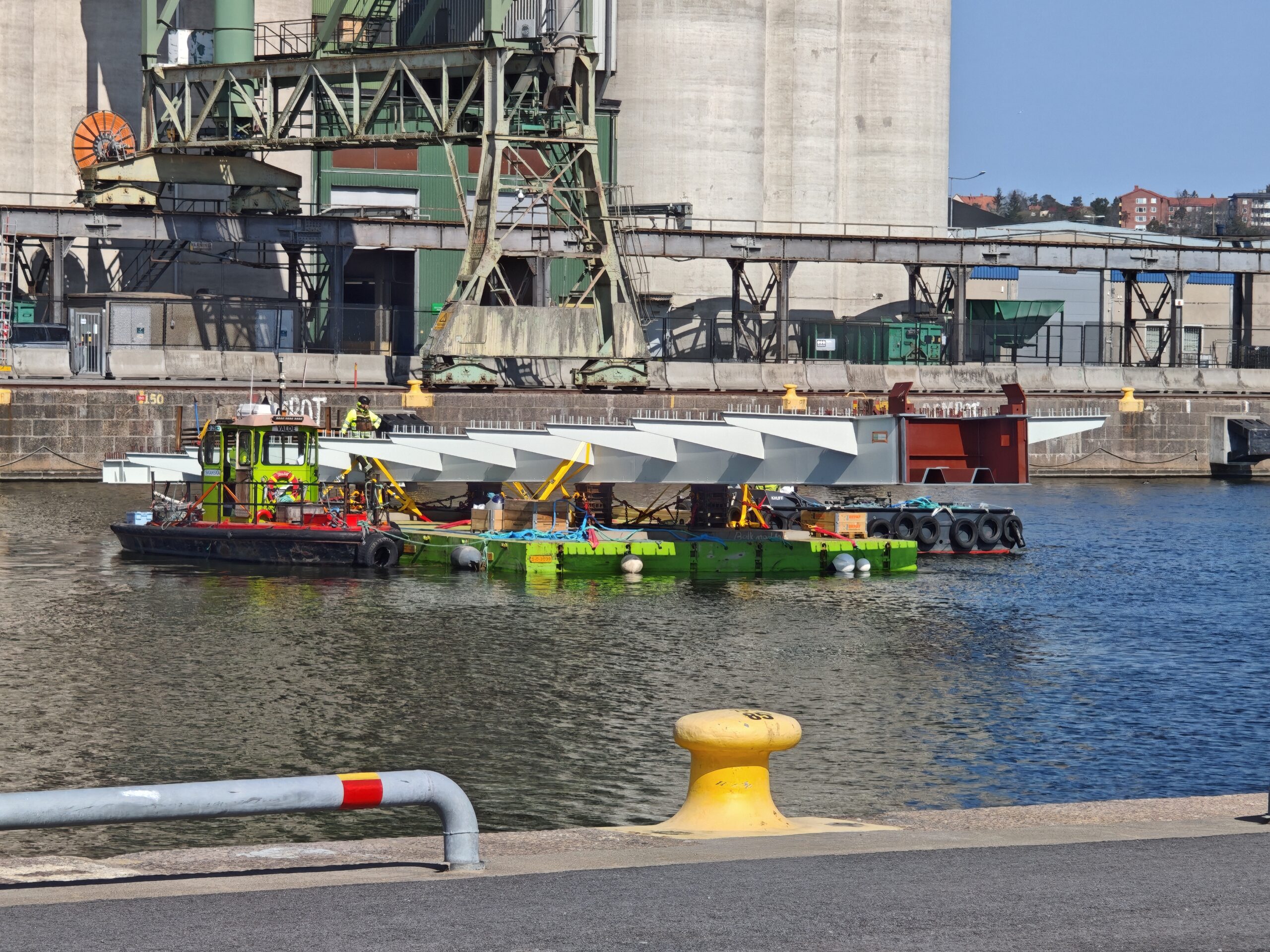 Brosektion A ligger nu utanför Victoriaslussen för att under tisdagen bli transporterad genom slussen. Foto: Lars Hamrebjörk. Brosektion A är den som kommer att gå igenom Victoriaslussen med pompa och ståt kl 15 tisdag 14 april. Foto: Lars Hamrebjörk