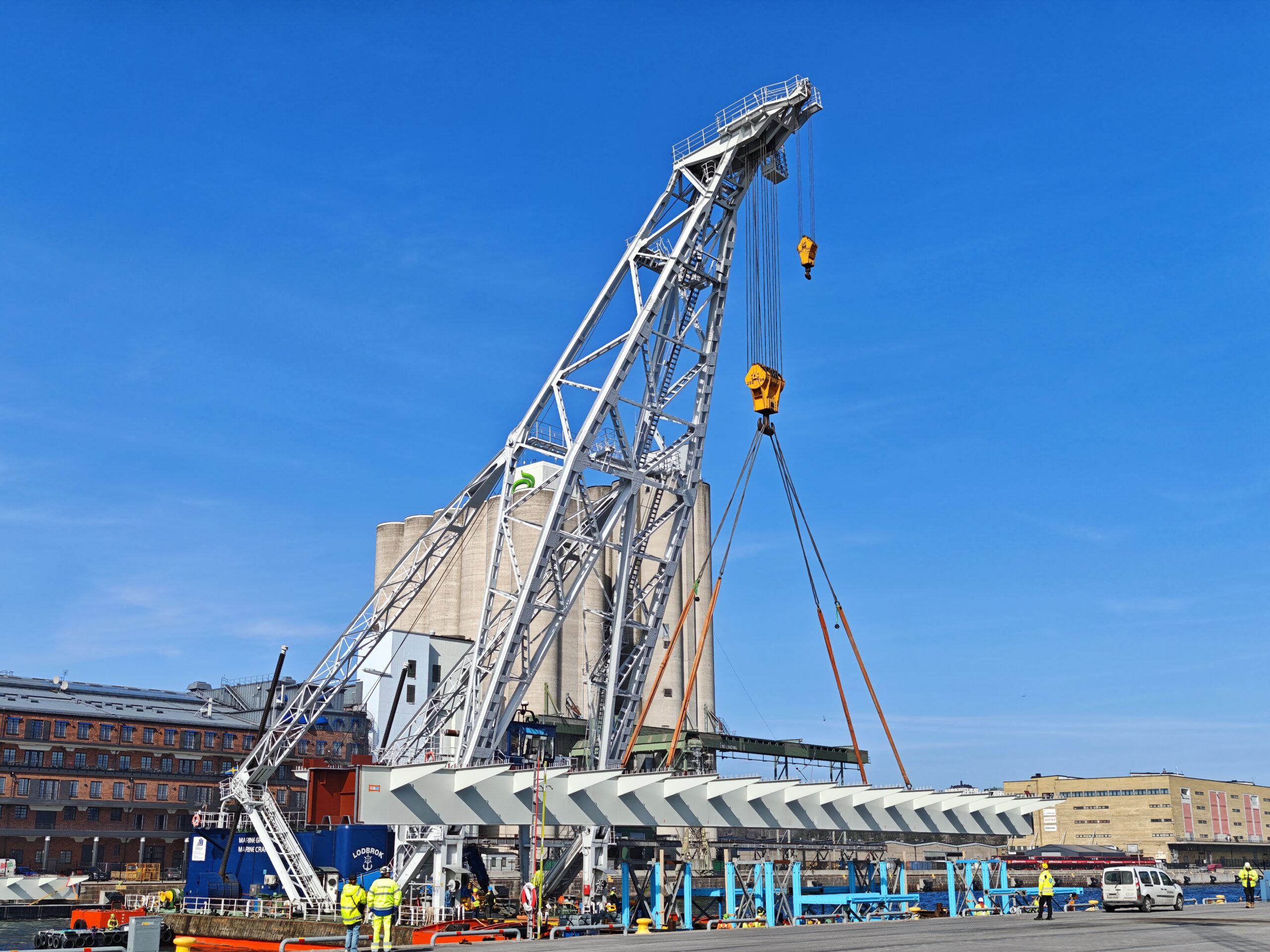 Här håller brosektion A att monteras på plats vid broanslutningen vid Gamla Stan. Det var den första brodelen som gick igenom Victoriaslussen, och som du kunde se på TV. Foto: Lars Hamrebjörk