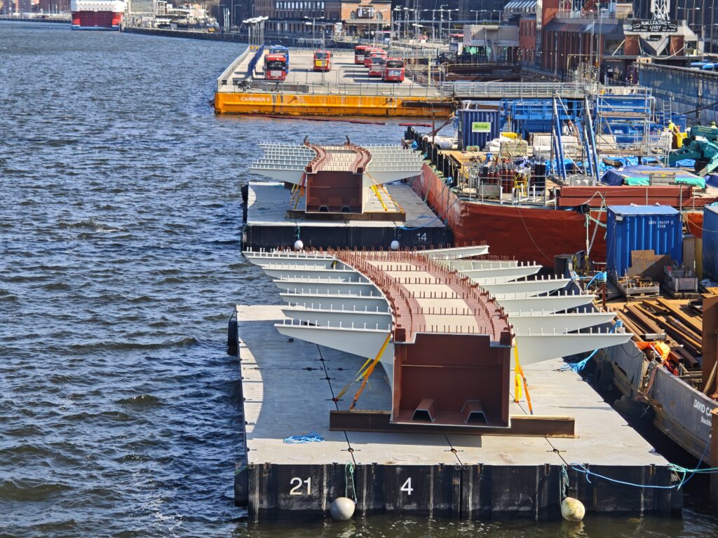 Brosektionerna E (21 m lång och 48 ton) och F (18 m lång och 48 ton) i väntan på transport till Slussen.